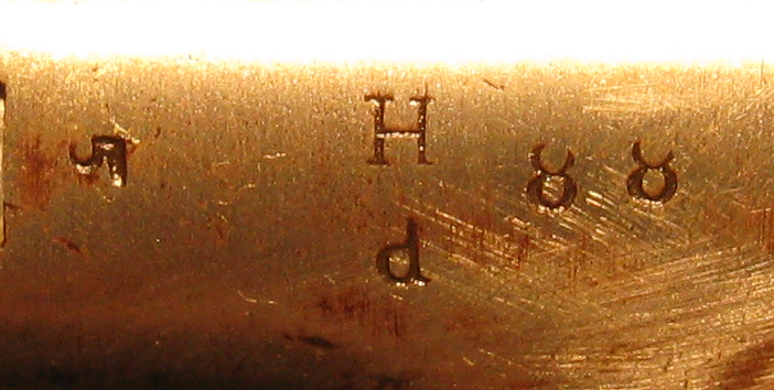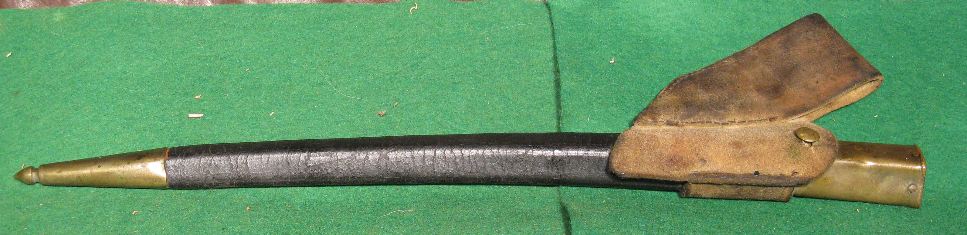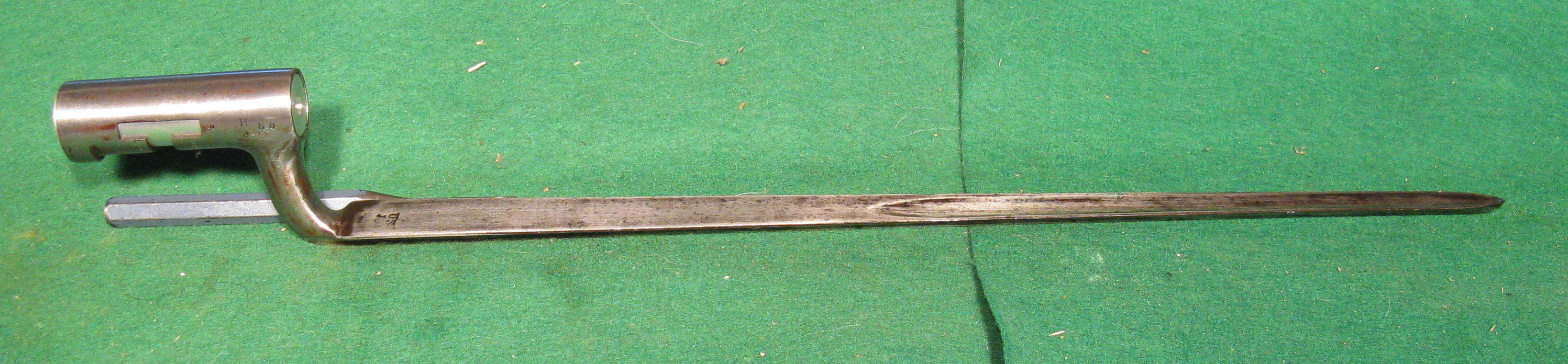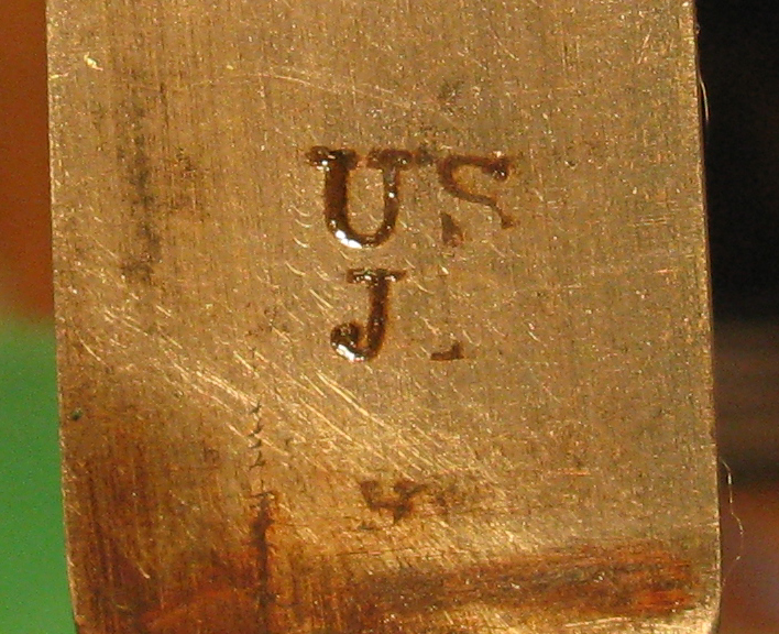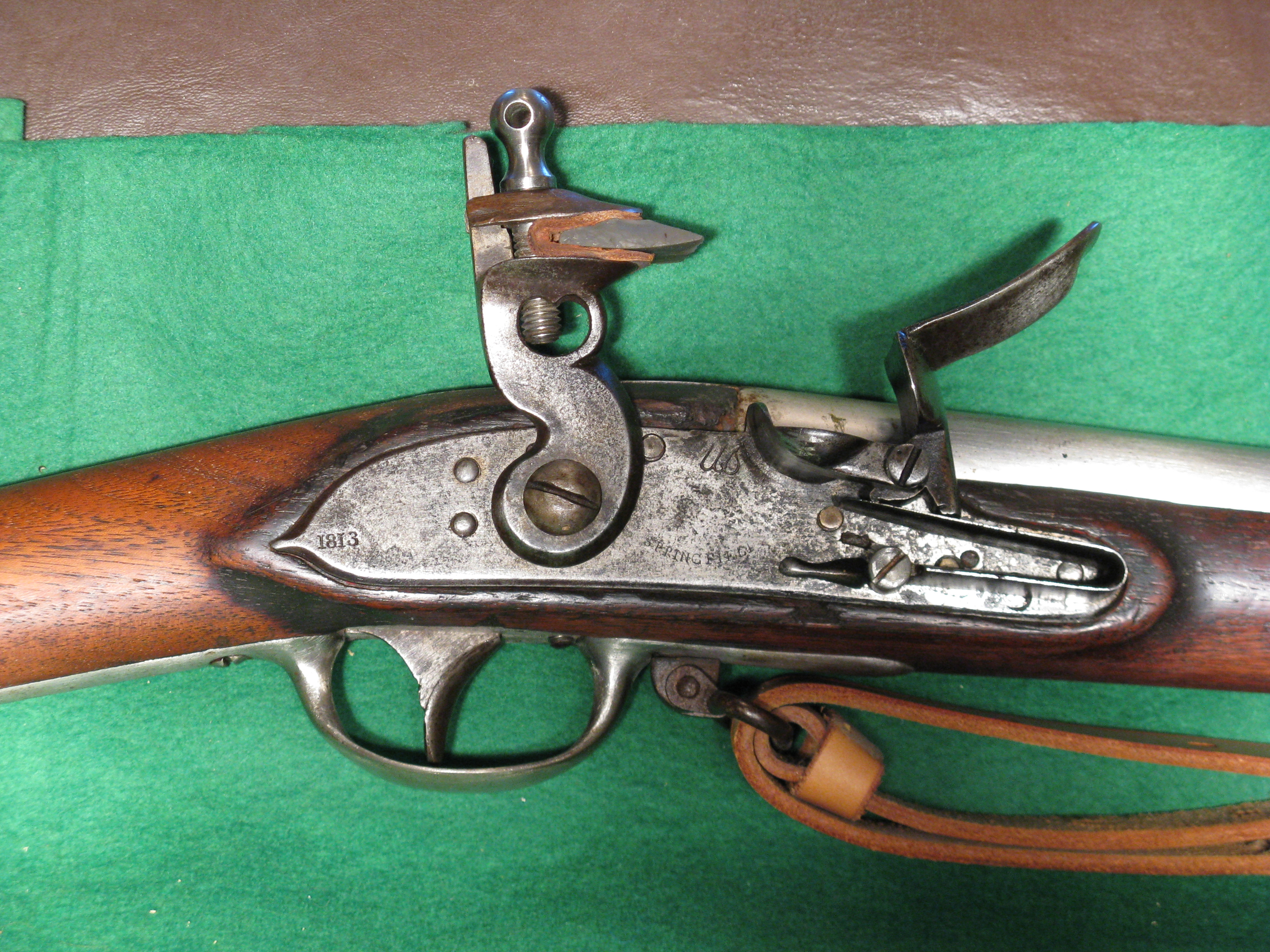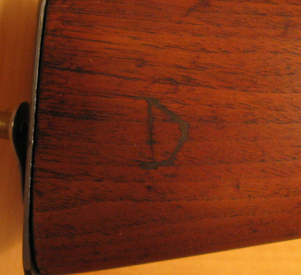 Our specimen is marked on the lock plate in front of the hammer in script US above an eagle and SPRINGFIELD below. Behind the hammer is 1813. The trigger plate is marker FCOY. The rear of the barrel is marked P eagle head V. The top of the butt plate is marked 1810. A six-sided star is marked on the left side of the stock and a D is carved on the right side of the stock. The bayonet is marked US JL. The socket is marked H d 88 5.