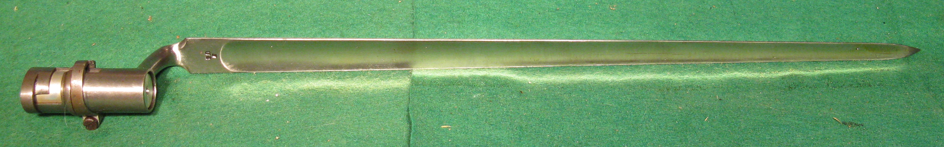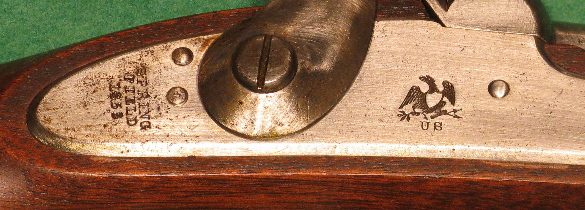 This specimen is marked on the lock plate in the rear of the hammer “SPRING” “FIELD” “1847” in three vertical lines reading to the rear. In front of the hammer, “US” under an eagle looking rearward. The barrel is 42 inches long, finished bright and marked “V” “P” with eagle head and dated 1846 on the breech tang. Also on the breech tang is stamped “48”. The bayonet is marked “US” “J”.