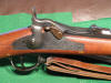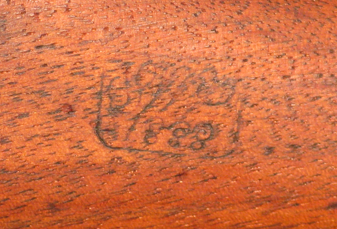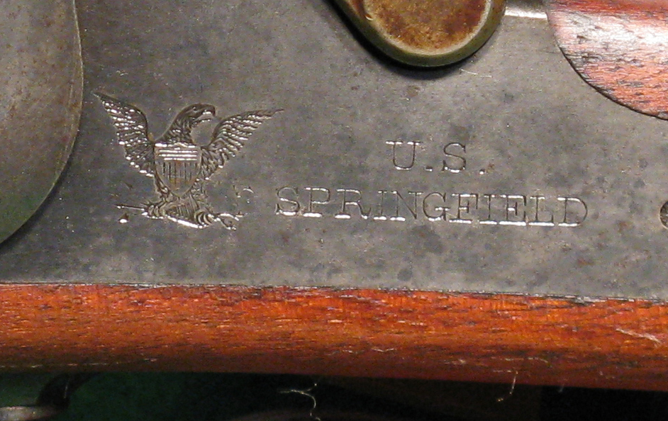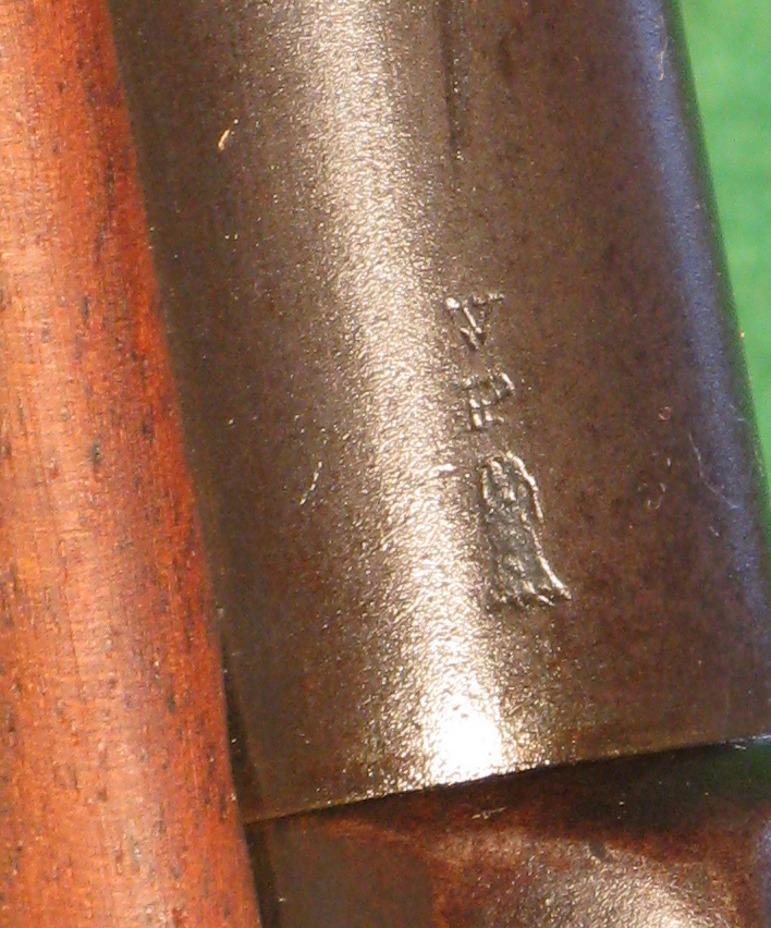 Our specimen is marked on the lock plate in front of the lock “U.S.” “SPRINGFIELD” in two lines and an eagle. On the front of the breech tang is the serial number 46503. The top of the breech block is marked “MODEL” “1873” eagle “U.S.”. The barrel near the breechblock is marked “V” “P” eagle head. The “V” and “P” appear to be double struck. The bands are marked “U”. The top of the butt plate is marked “US”. There is an inspector’s cartouche on the left side of the stock marked “SWP 1888”. The bayonet is marked “US”. The scabbard is marked “WATERVLIET ARSENAL” “J. BOYD”. The sling is stamped “ROCK ISLAND” “ARSENAL” “E.H.S.”. The serial number dates manufacture of the breechblock and receiver to the second quarter of 1875. The inspector’s cartouche dates the stock. The trigger is the smooth-faced type used before March, 1883. The ramrod is pre-August 1878. The lock plate is post-1878. Prior to this the lock plate was marked with the model year. The thumb piece is post-March, 1876. The hammer has the later style checkering and the post-January, 1880 lip under the head. The sight is the third form Model 1879 sight. The notch in the lower edge of the buckhorn is rounded and beveled. The fourth form was made straight at the bottom.