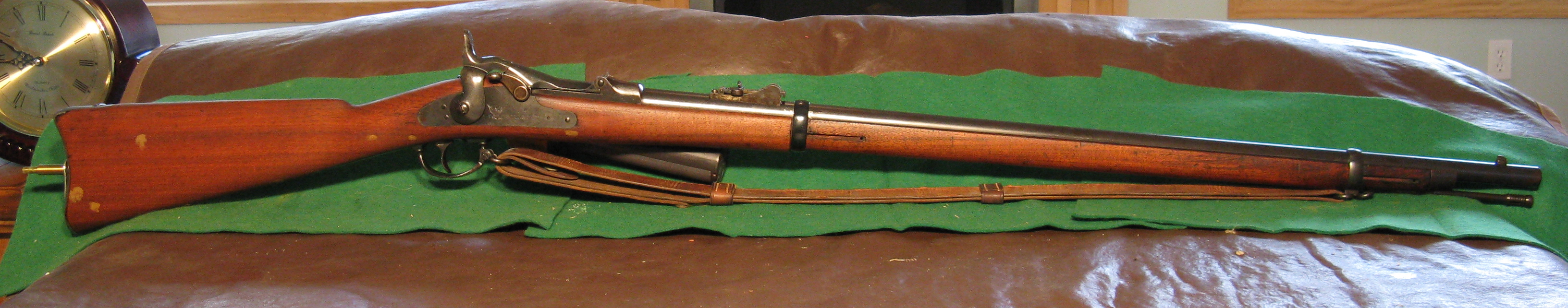 This model was approved on May 20, 1873. At that time, also approved were the proceedings of an Ordnance Board which selected caliber .45 as the standard caliber for all small arms. The Model 1873 differs from the Model 1870 primarily in the reduction of caliber to .45, taking a center-fire cartridge of 70 grains of powder and a 405 grain bullet, the cartridge being known as 45-70-405. The total length is 51 7/8 in.. The barrel length is 32 1/2 in.. The rifling consists of 3 grooves .005 in. deep, with 1 turn in 22 in.. The muzzle velocity was 1350 fps. Penetration in white pine was as follows: 20.8 in. at 10 yds., 17.2 in. at 100 yds., 12.4 in. at 200 yds., 10.2 in. at 300 yds., 8.8 in. at 500 yds., 6.4 in. at 700 yds., 3.7 in. at 1200 yds.