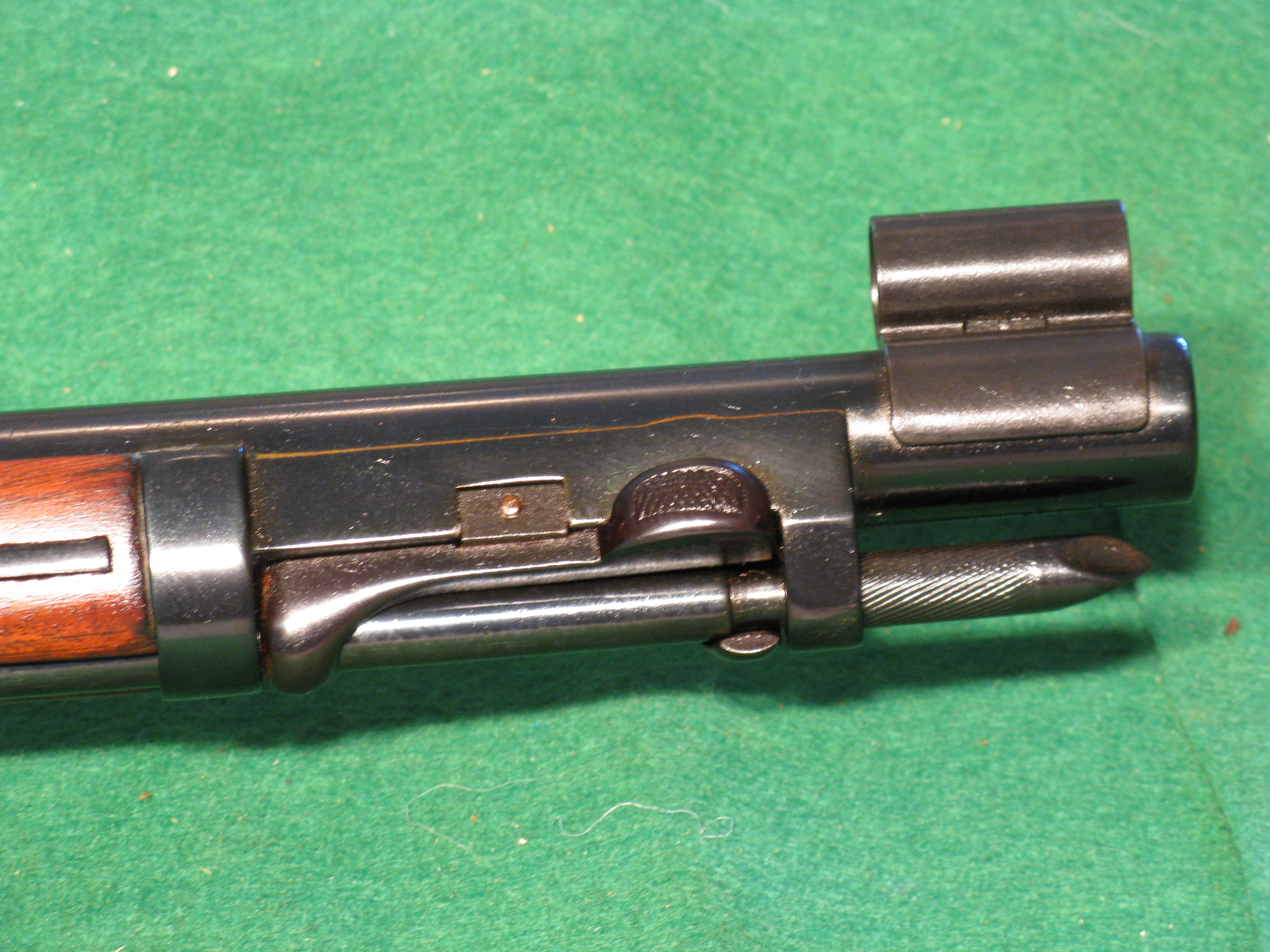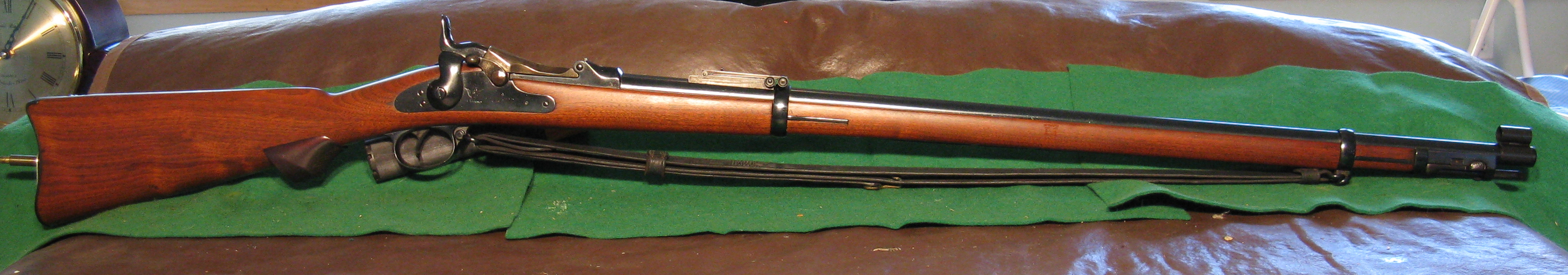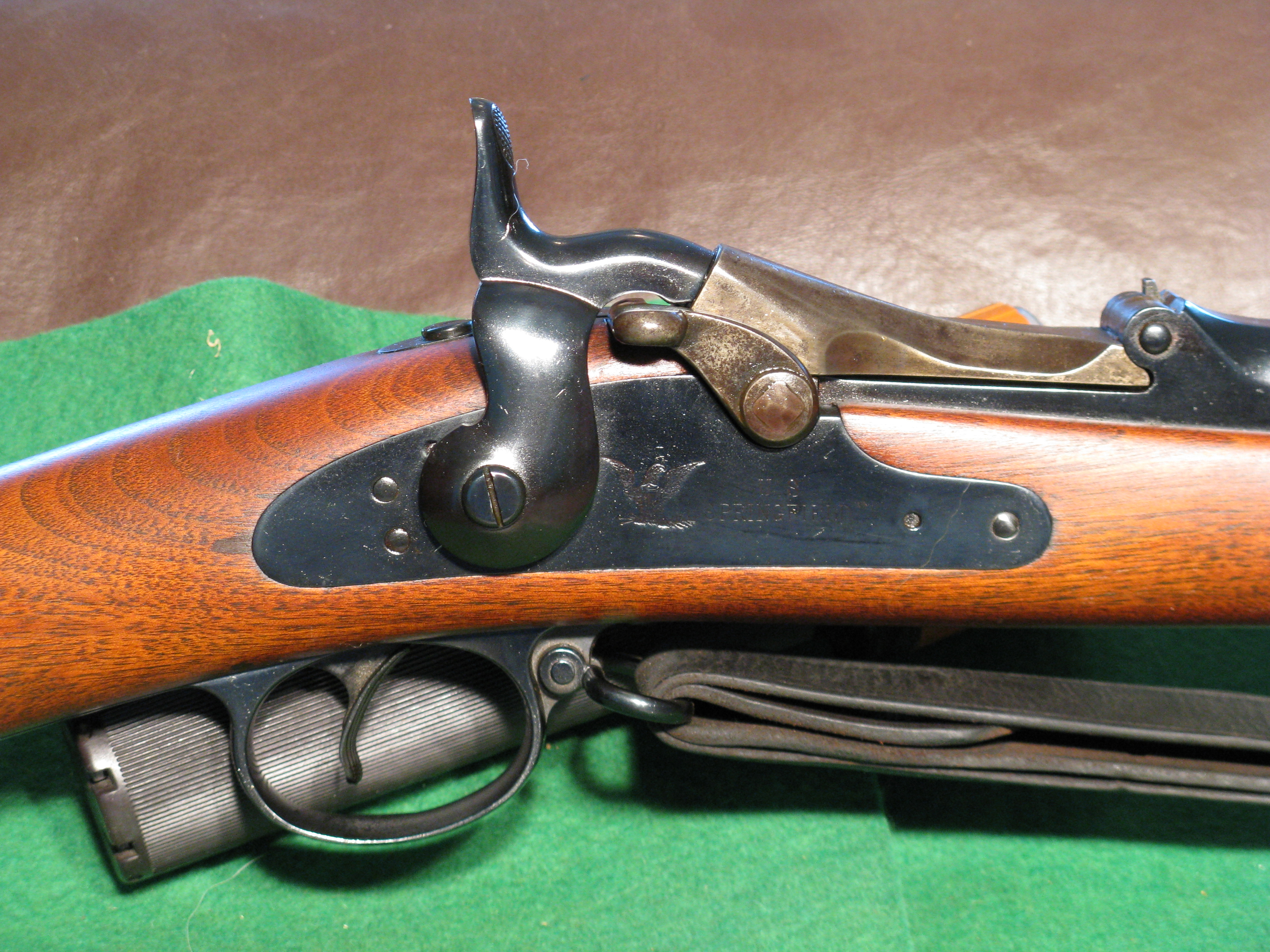 Approved for manufacture by the Secretary of War on August 16, 1889, as a standard rather than experimental model, the rifle was derived from the experimental Model 1884 ramrod bayonet rifle. A new design feature in the model was a one-piece milled guard combining the guard plate and the guard bow in a single unit. The guard swivel was riveted to the guard bow. The bayonet was released by pressing the exposed checkered buttons of the spring-backed catch to rotate and unlock it. The bayonet could then be pulled out to “fixed position”, where the catch mechanism then engaged the lower set of locking grooves. The buttstock was fitted with a trap buttplate giving access to a receptacle in the buttstock containing a headless shell extractor, Model 1879 combination tool, and a wiper. 64,822 rifles of this model were produced. This was the last of our single-shot large caliber arms.