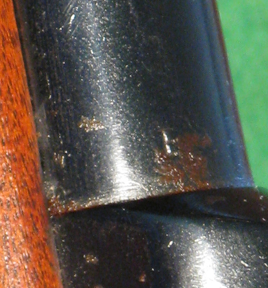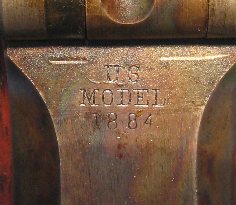 Our specimen has the serial number 563064. The top of the breechblock is marked “US” “MODEL” “1884” in three lines. The left side of the stock has an inspector’s cartouche “SWP 1893”. The barrel is marked “P”. The buttstock receptacle contains the shell extractor, combination tool, and wiper.