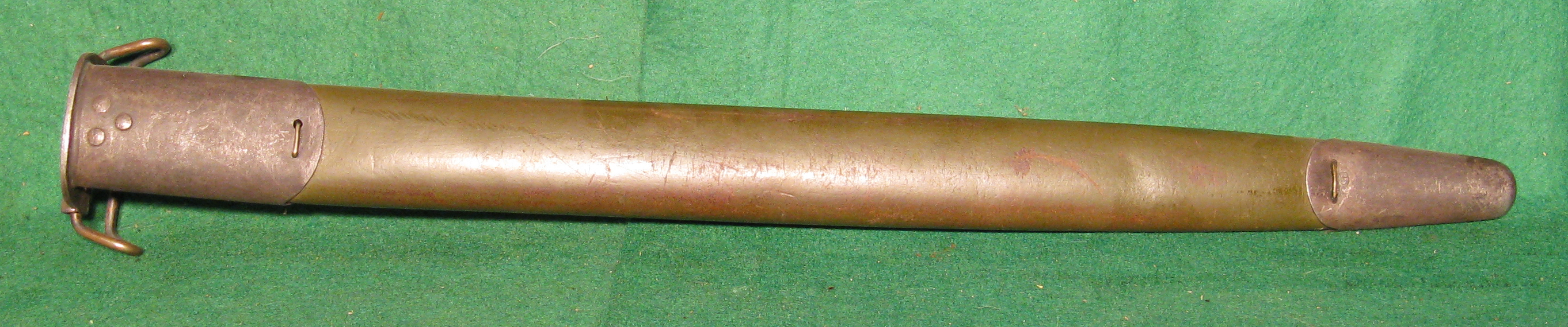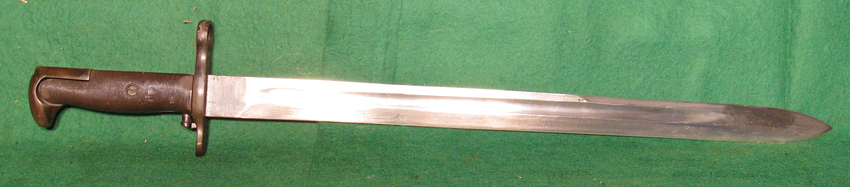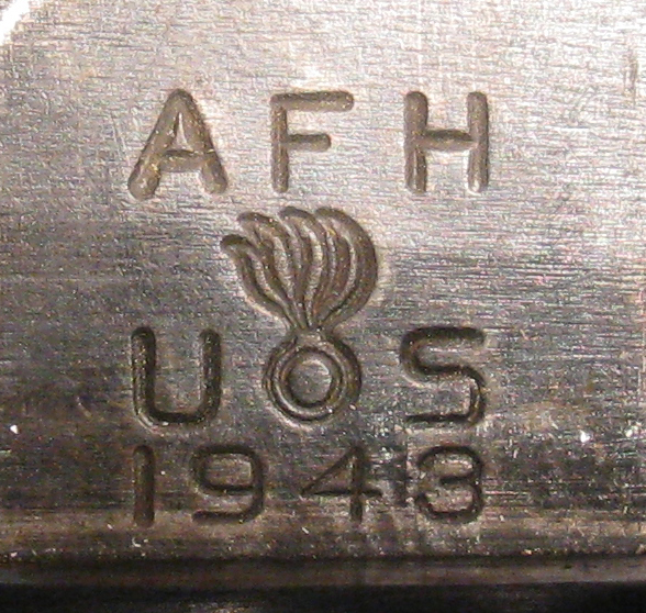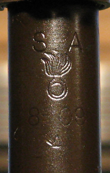 Our specimen is marked on top of the receiver “U.S.” “SPRINGFIELD” “ARMORY” “MODEL 1903” in four lines and the serial number 1348430. The barrel is marked behind the front sight “SA”, flaming bomb and “8-09” indicating the date of manufacture. The left side of the front sight is marked “C64157-4”. The bottom of the stock in the rear is marked “01836-4”.