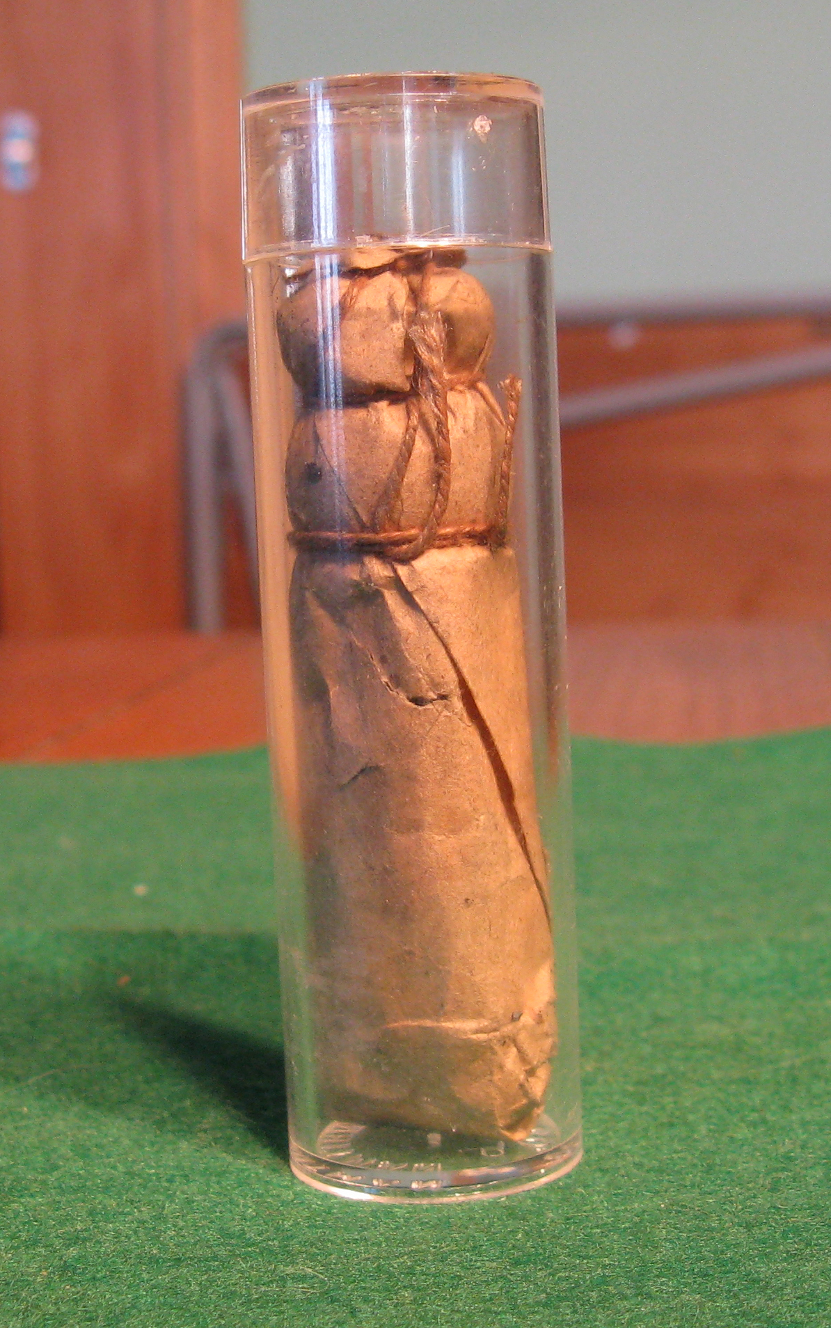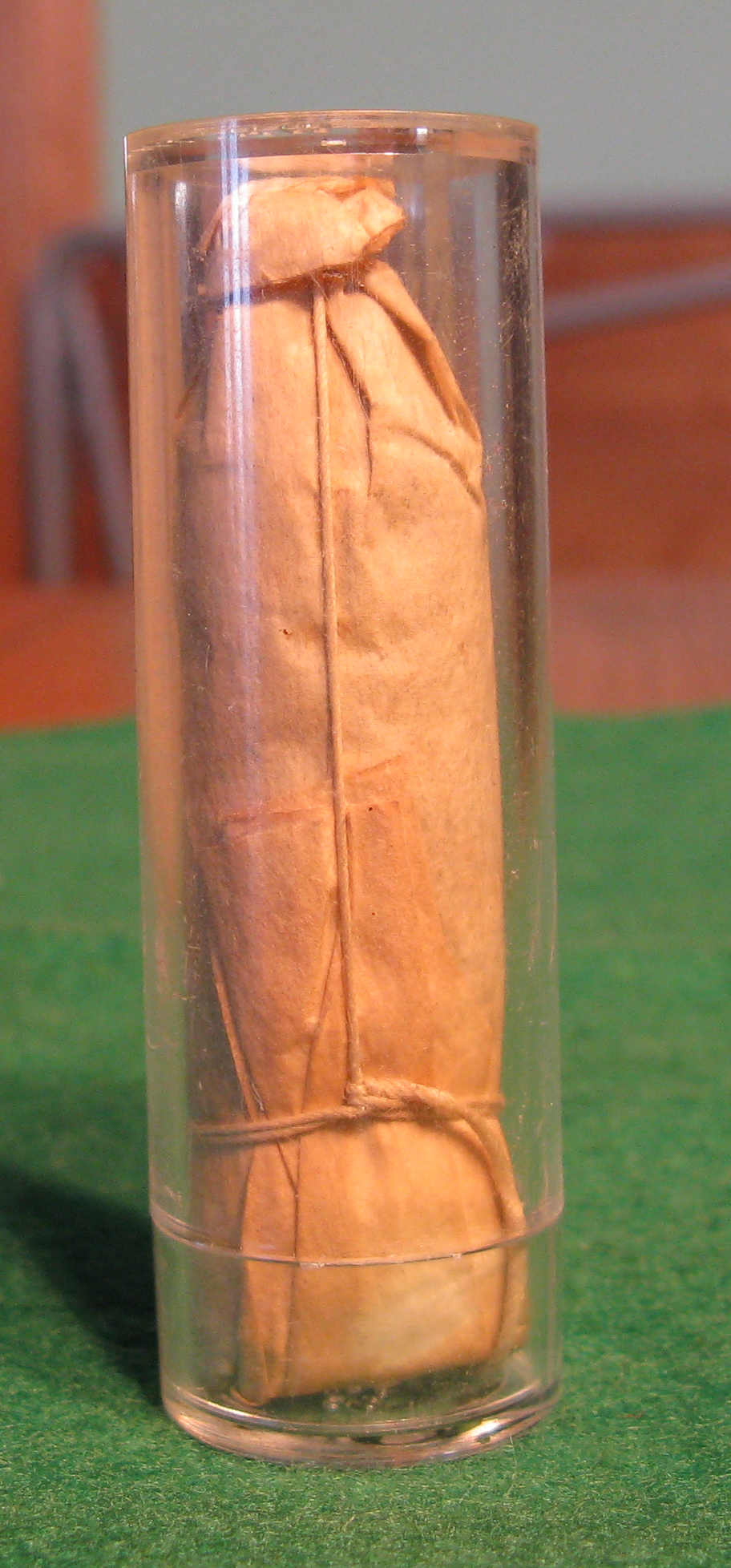 The buck and ball cartridge contained a .69 caliber ball with three .31 caliber shot loaded on top. A string formed half hitches between the projectiles and below the large ball. The buck and ball load was always loaded with the paper covering since the string ties were intended to keep the shot and ball together until out of the muzzle. The photo on the right shows a .58 caliber minie bullet seated on top of the powder charge.